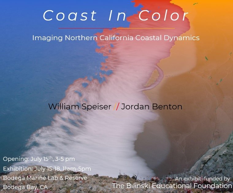 In Coast In Color, William Speiser and Jordan Benton present their collaboration showcasing coastal dynamics in Northern California. Their work observes these imprints of natural physical processes, captured and highlighted through photographic and computational media. Computer algorithms are used to interpret photographs and satellite images by isolating color to measure geophysical elements. The exhibition focuses on regions of ongoing study here at the Bodega Marine Lab.